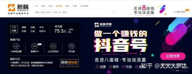 供给红人榜、粉丝榜、新锐榜等抖音排行榜单,以及抖音热门视频预测,案例阐发,每天拆解一个爆款视频,用数据实现抖音增粉。